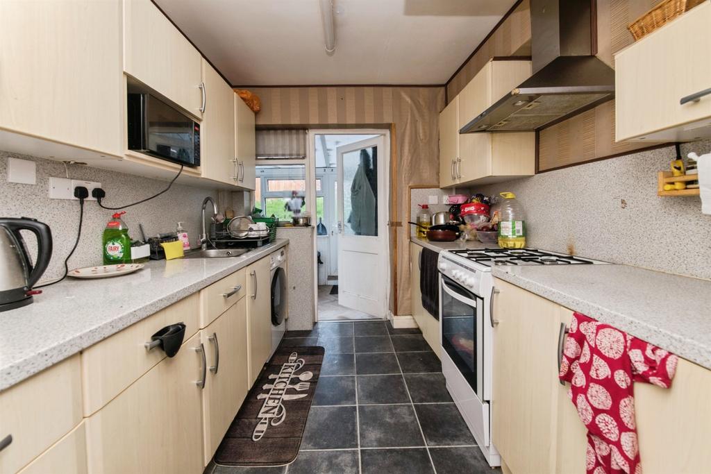 Wall and base units, work surfaces, plumbing for washing machine, oven, gas hob with extractor over, sink unit, door to...
