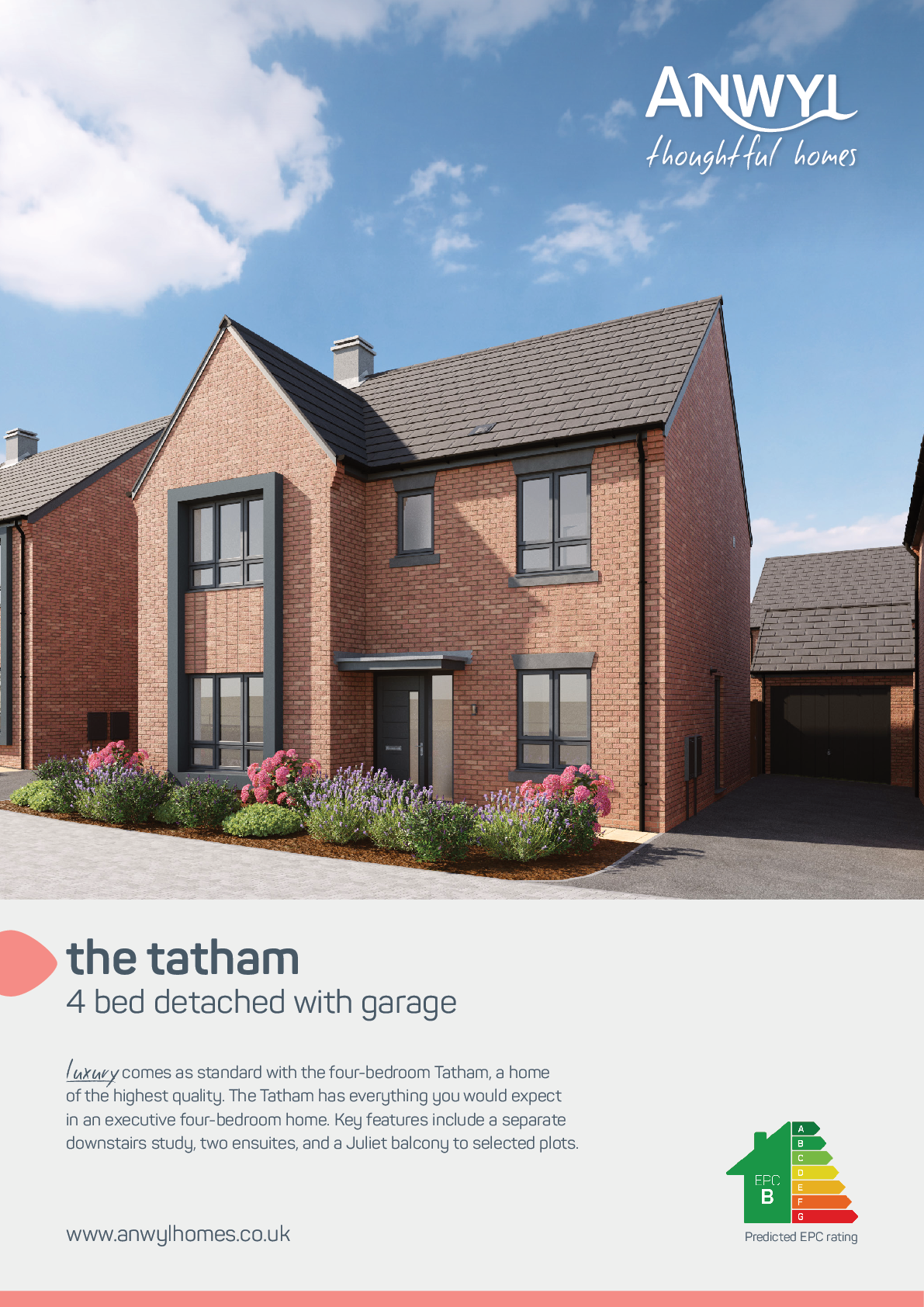 The Tatham is a grand four bedroom, three bathroom home boasting two ensuites. The expansive kitchen/dining/family area with French doors leading to the rear garden is perfect for entertaining, whilst the large living room and separate study offer tranquil spaces to work and unwind, making this an ideal family home.