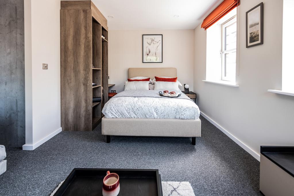 The bedroom area has plenty of space with a built-in wardrobe and a modern main bathroom.