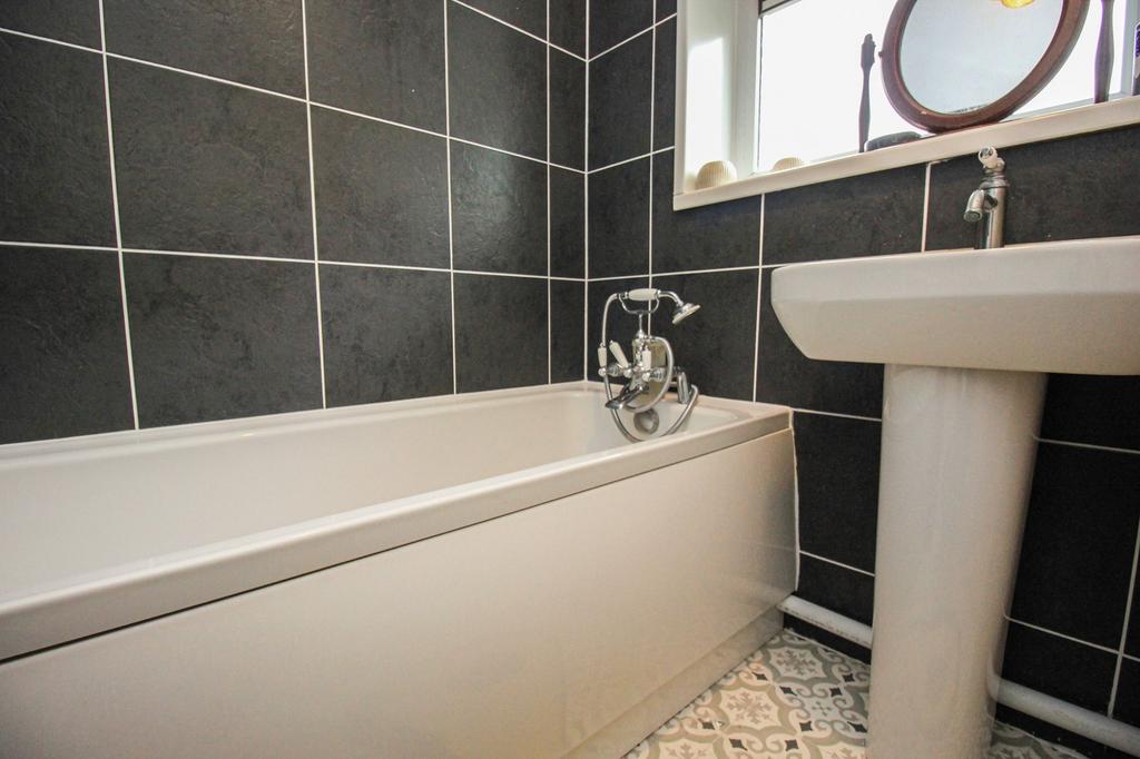 The newly fitted bathroom has a double glazed window to the side aspect, laid to vinyl flooring and fully tiled walls, a bath with a shower over and a wash hand basin.