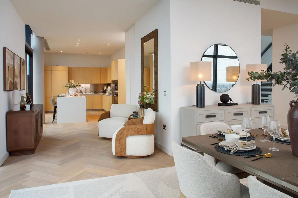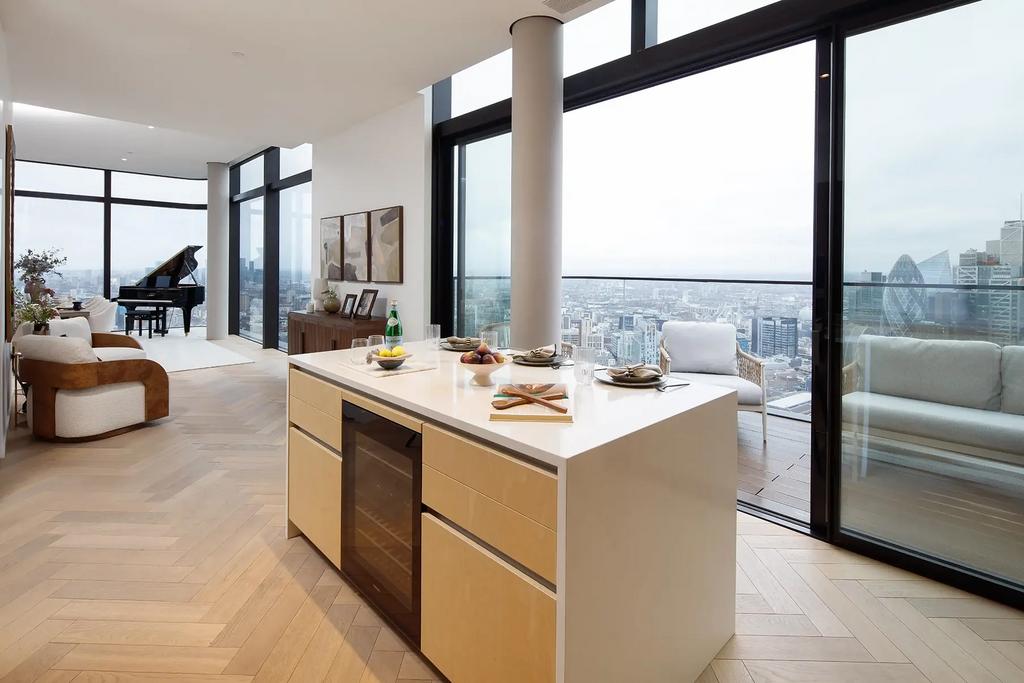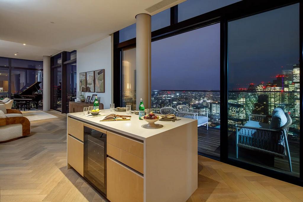 A very large balcony with panoramic skyline views of London provides the perfect entertainment area to soak in the stunning surroundings.