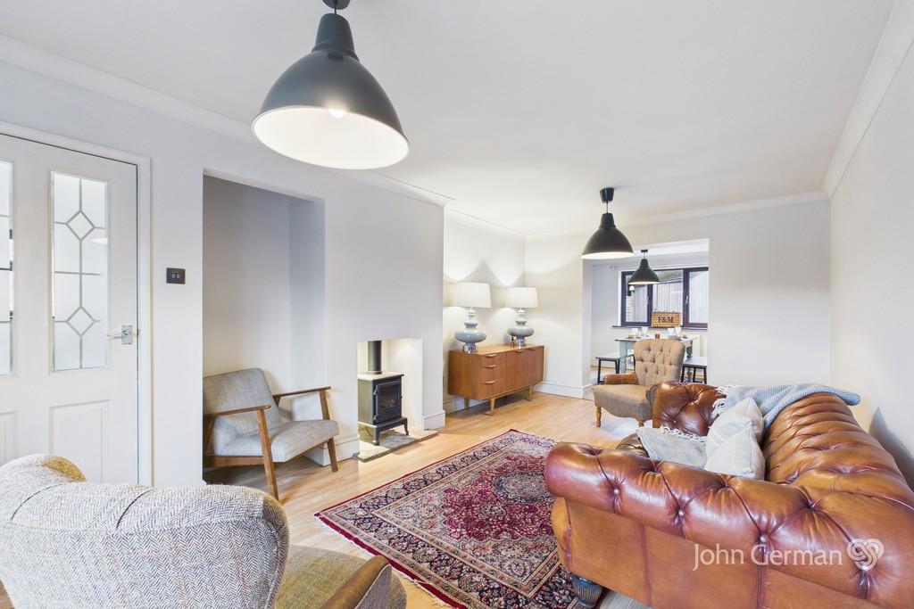 To the right, the generously sized living room features a front aspect window and a charming feature fireplace. This flows seamlessly into the dining room, which enjoys a rear aspect outlook. The two rooms are currently open plan, offering a spacious feel, but can easily be separated if desired.