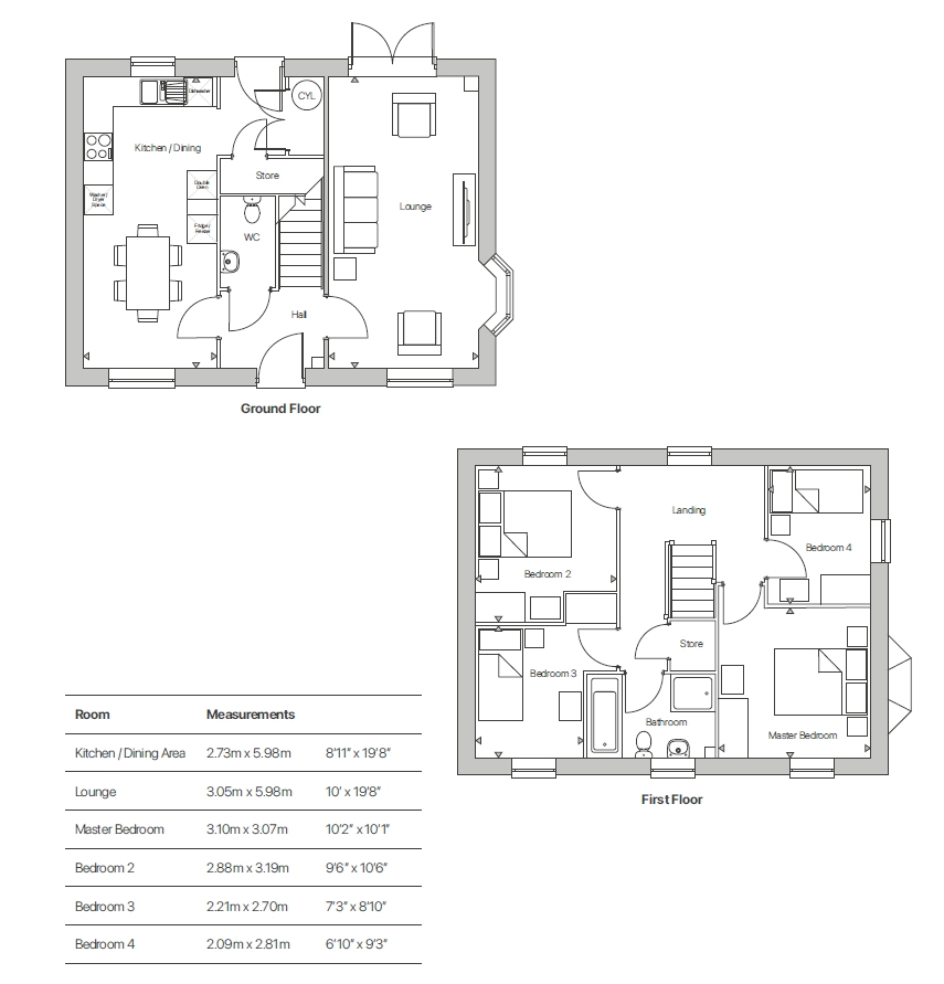 The Ticknall is a beautiful 4-bedroom home which is perfect for family living. From the hallway, at the front of the property, you’ll find a large open plan kitchen/dining area. The spacious lounge/dining area runs the width of the property and has double doors leading out onto the rear garden. The ground floor offers plenty of storage space with two separate storage cupboards and there’s also a separate wc. As you move up to the first floor you’ll find the master bedroom, complete with its own ensuite. Bedrooms two and three are good-sized double rooms and along with bedroom four share a family bathroom. There’s also a handy storage cupboard.