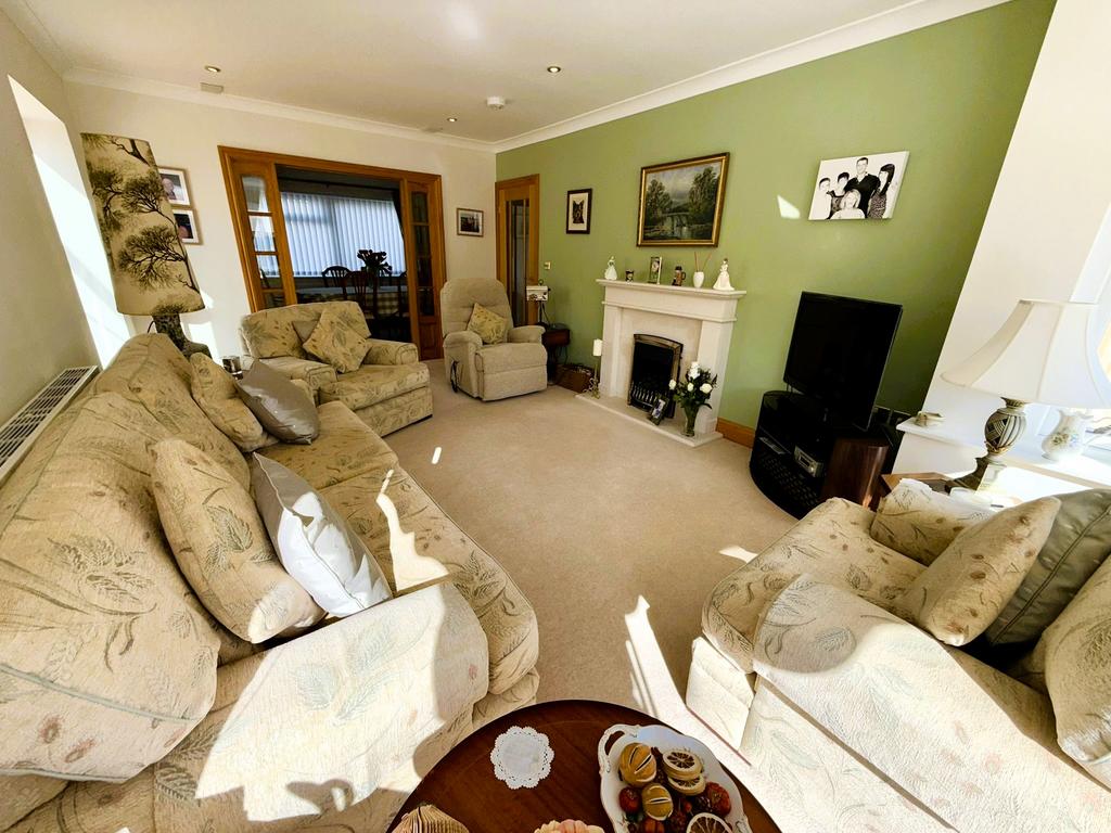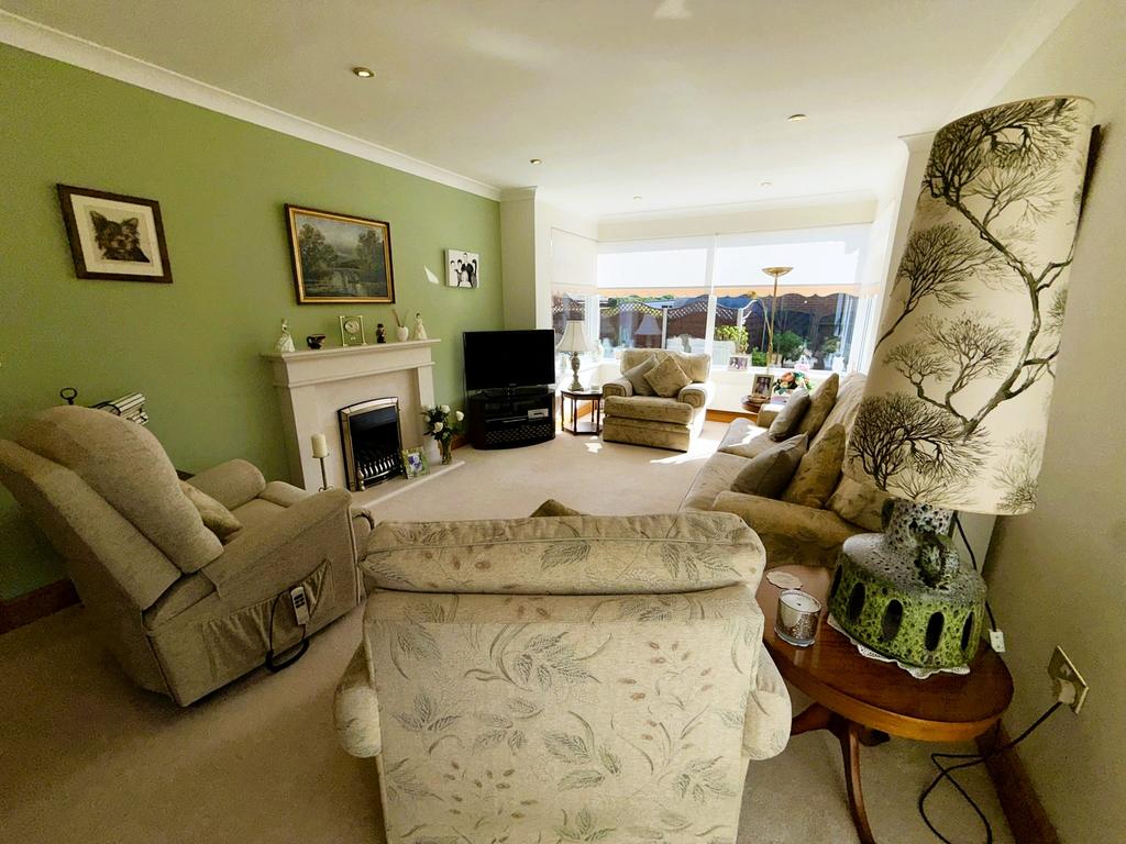 Two-double radiators, coved ceiling, inset ceiling speakers, inset lighting, large double glazed square box bay window to rear, feature fireplace, double glazed glass doors opening into the Conservatory and glazed double doors with glazed side panels into: