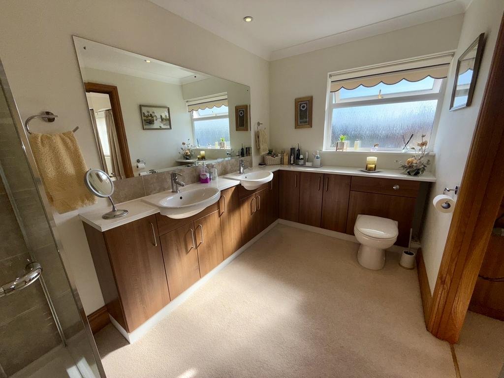 Chrome effect ladder style radiator, large glazed and tiled walk-in shower cubicle with both spray and rain heads, large vanity unit incorporating his and hers wash hand basins with cupboards below and adjoining WC, large wall mirror, coved ceiling and inset lighting.
