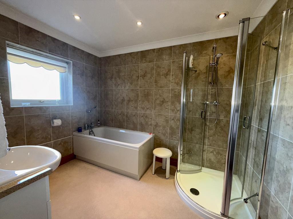 A four piece suite comprising of glazed and tiled shower cubicle with mains operated shower, panelled bath with mixer tap and shower head, vanity unit incorporating wash hand basin with cupboard spaces below and WC, vanity mirror, tiled walls, coved ceiling and inset lighting, double glazed window to front and chrome effect ladder style radiator.