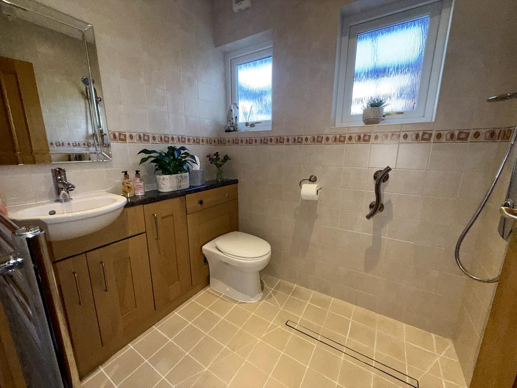 Tiled floor and walls, chrome effect ladder style radiator, vanity unit incorporating a wash hand basin with cupboards below and adjoining WC, ‘Creda’ shower, two-double glazed windows to side, inset lighting and extractor fan.