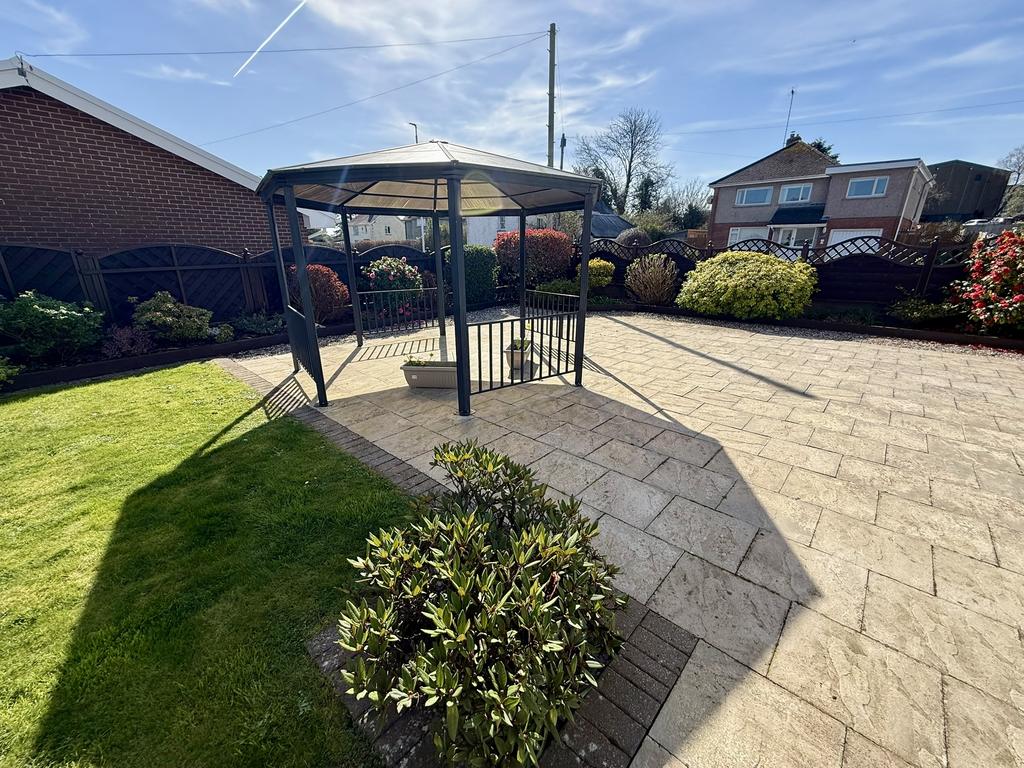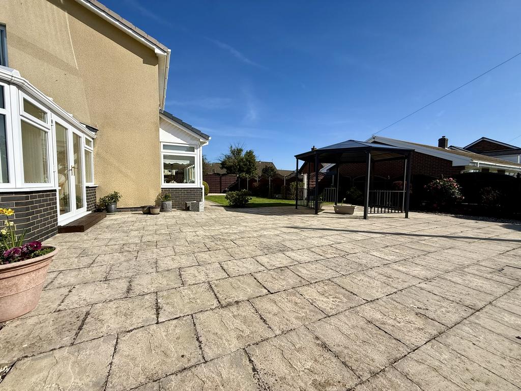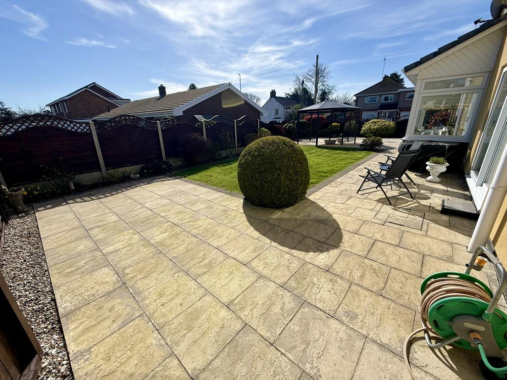 A gated pathway leads to the rear of the property with a large, paved patio/ terrace with fixed pergola and adjoining low maintenance borders. Adjoining rectangular level lawned garden area with further adjoining patio area again with established borders. A gated pathway leads to a further hard surfaced area again with planted and elevated borders.