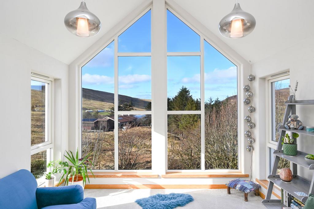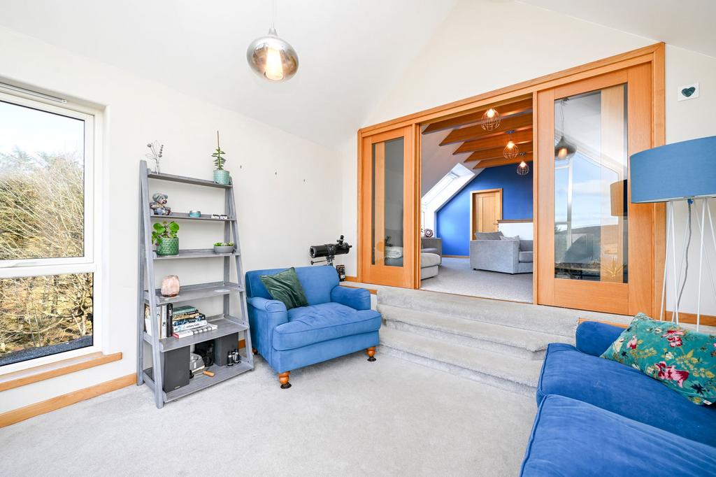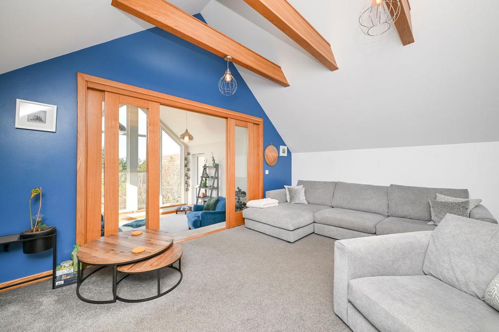 Upon entering the home through the welcoming front porch and moving up the stairwell, the split-level lounge is situated directly above the porch. The lounge is well proportioned and features a cathedral ceiling with exposed beams and a large Velux window. The beautifully presented sun lounge is accessed through oak glass-panelled sliding doors, with windows spanning the gable, allowing natural light to flood the room.