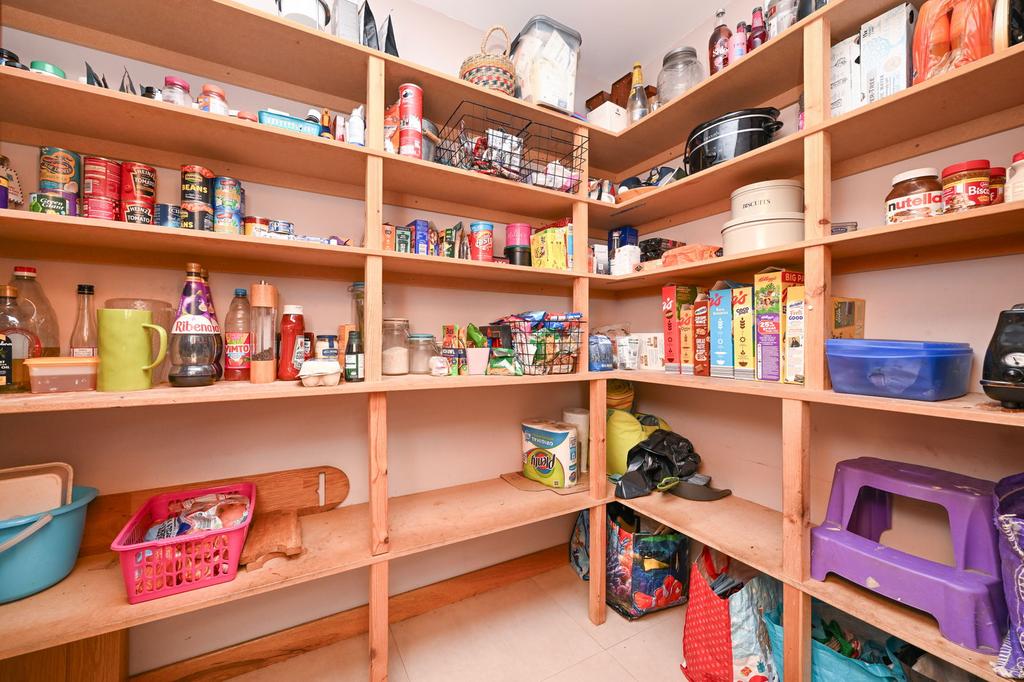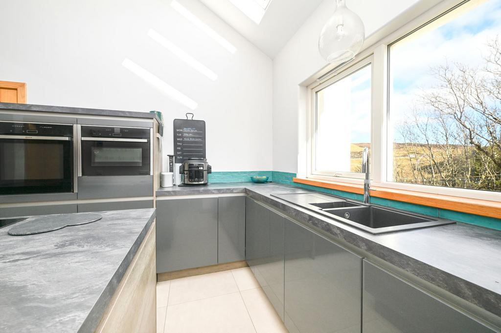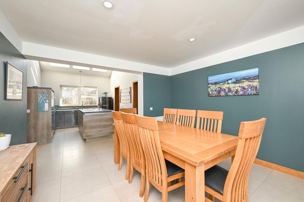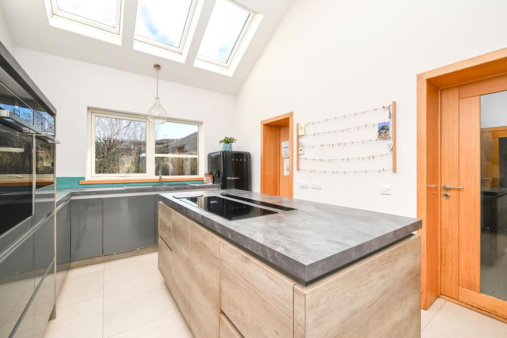 The kitchen/diner is modernly presented and generously proportioned. The kitchen is fitted with base-mounted units, a large kitchen island, marble countertops, and integrated NEFF appliances, including a combi oven, dishwasher, and large induction hobs. The kitchen is enhanced by three large Velux windows and a substantial offset pantry. The dining area is generously proportioned with ample floor space to accommodate a large dining table, and is advantageously fitted with patio doors providing access to the decked patio.