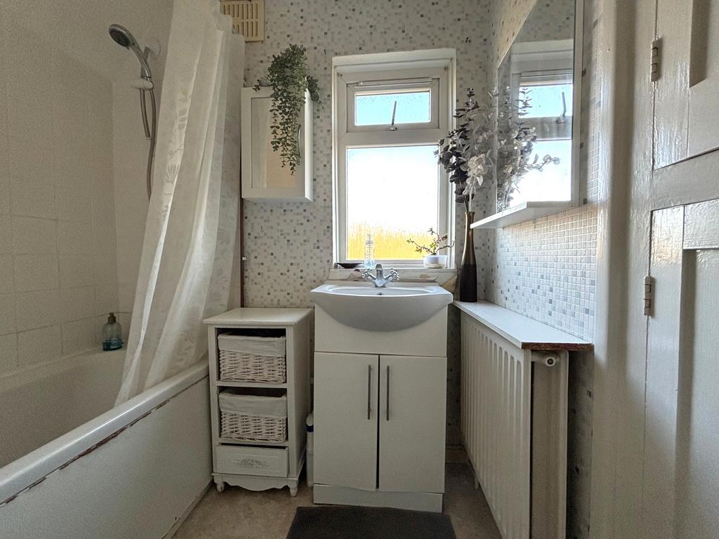 BATHROOM: Obscure double-glazed window, panelled bath with fully tiled surround, mixer tap, Mira shower over, vanity wash basin with mixer tap, radiator, shelved cupboard.