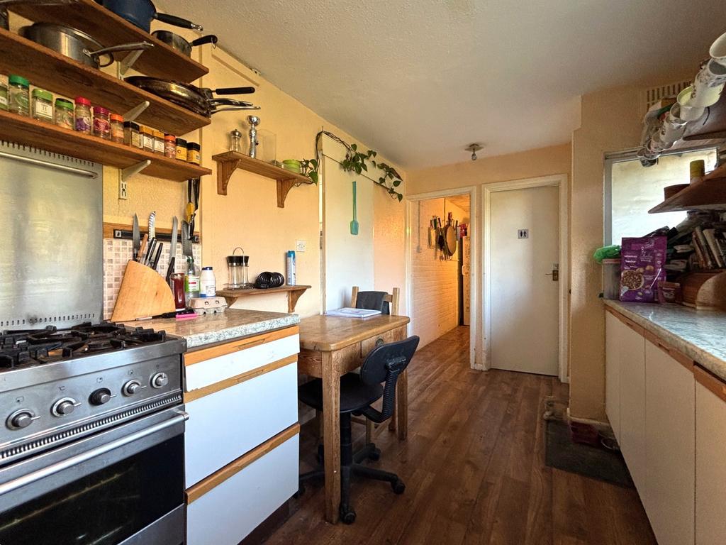 KITCHEN (W):15’5” (4.71m) x 8’ (2.45m). Single drainer sink unit with mixer tap and work surfaces with drawers, cupboards and appliance spaces under, space for gas cooker. Part glazed wooden door to garden.