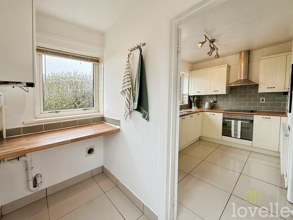 Tiled flooring, space for white goods, wall-mounted boiler, under-stairs storage, window to rear aspect and door to rear garden.