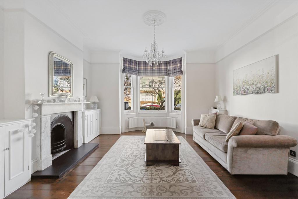 Adjacent lies a further reception room, ideal as a formal dining room or an additional sitting room. This space mirrors the principal reception, featuring its own marble fireplace, exposed floorboards and bespoke built‑in cabinetry.