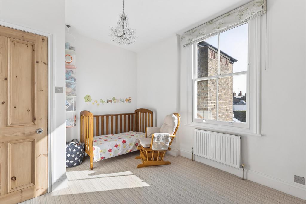 The first floor hosts the principal bedroom, bathed in light from twin sash windows, alongside a well-appointed family bathroom and a further double bedroom. A mezzanine level provides an additional bedroom, while the upper floor features a bright and versatile bedroom / office with skylights and is fitted with a desk and drawers.