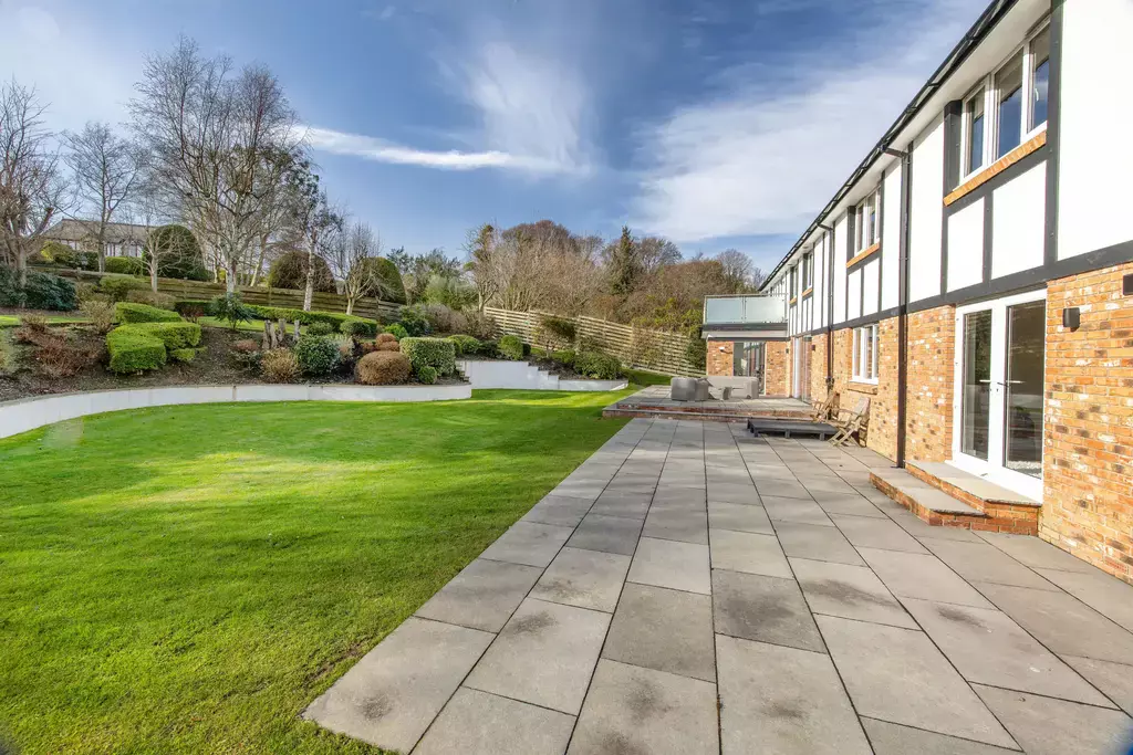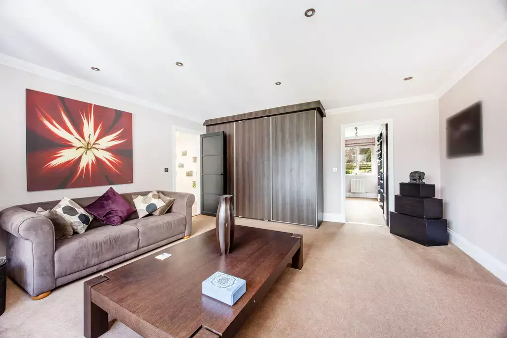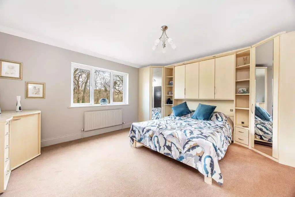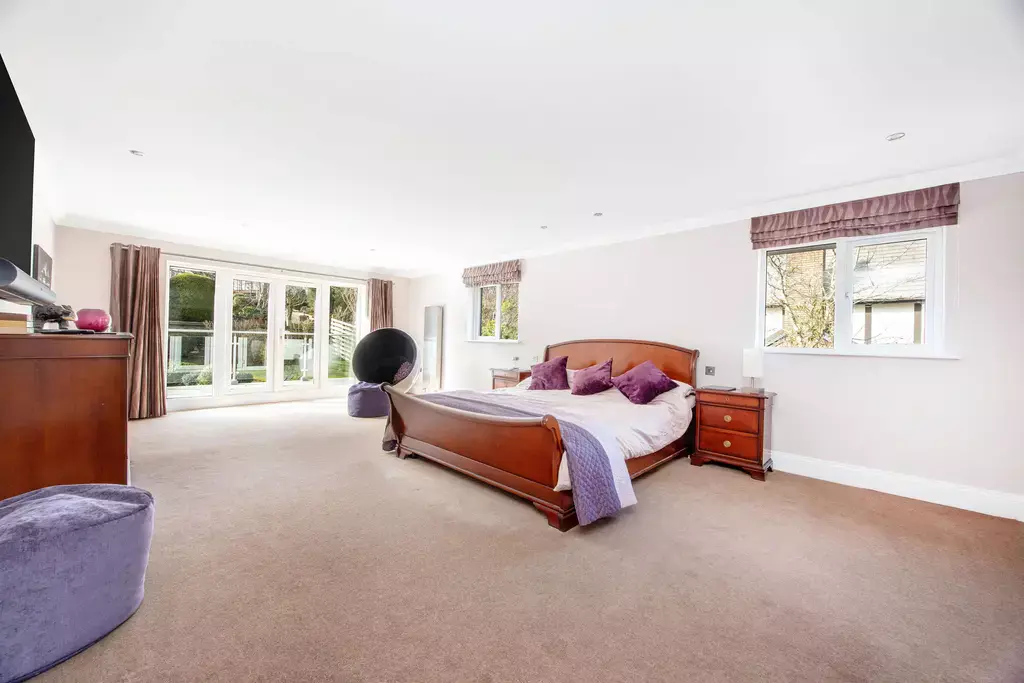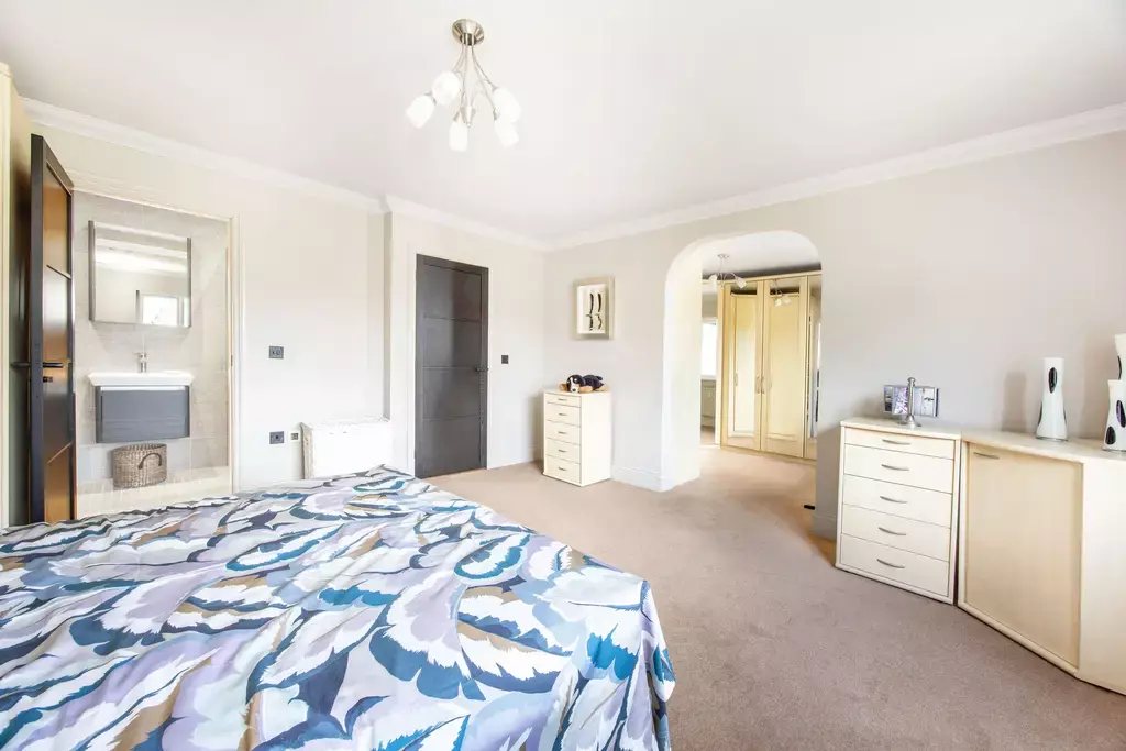 The principal bedroom suite offers a true sense of retreat, featuring a generous bedroom with a private balcony enjoying aspects over the beautiful gardens, a separate sitting room, dressing room, and a luxurious en-suite with a feature vaulted ceiling. Three further double bedrooms are beautifully appointed, supported by an additional dressing room, further en-suite facilities, and a high-specification family bathroom.