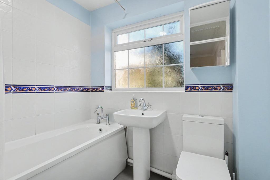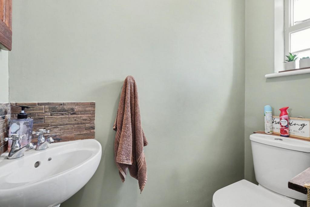 Modern two piece suite comprising push button W.C and wall mounted vanity wash hand basin with tiled splashback. Tiled effect flooring. Window to front aspect.
