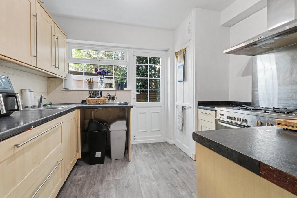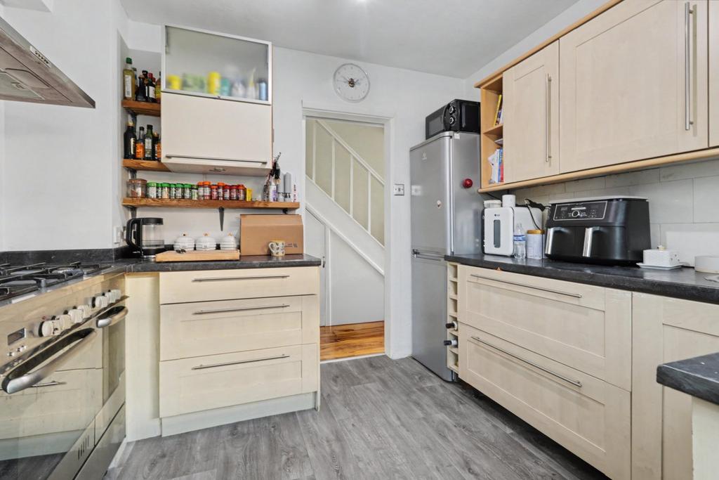 Fitted with a range of eye and base level units with roll edge work surfaces incorporating a stainless steel sink and drainer unit. Space and plumbing for dishwasher. Space for range cooker with chimney style extractor above. Space for tall fridge/freezer. Additional features include chef’s drawers, wine rack and storage cupboard. Tiled effect flooring. Double glazed door with adjacent window providing access to the outside.