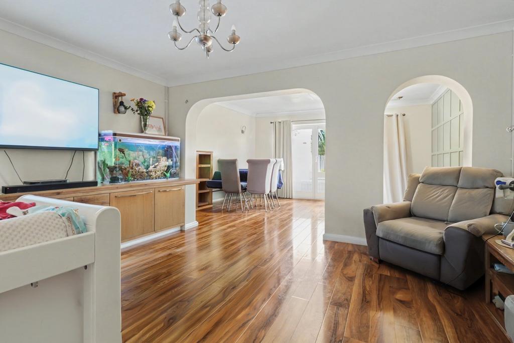 A large open plan living space that extends into a dining area. Double glazed sliding patio doors provide access to the rear garden.