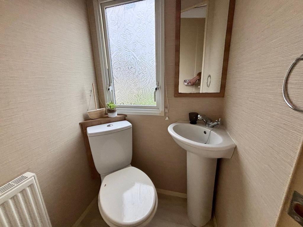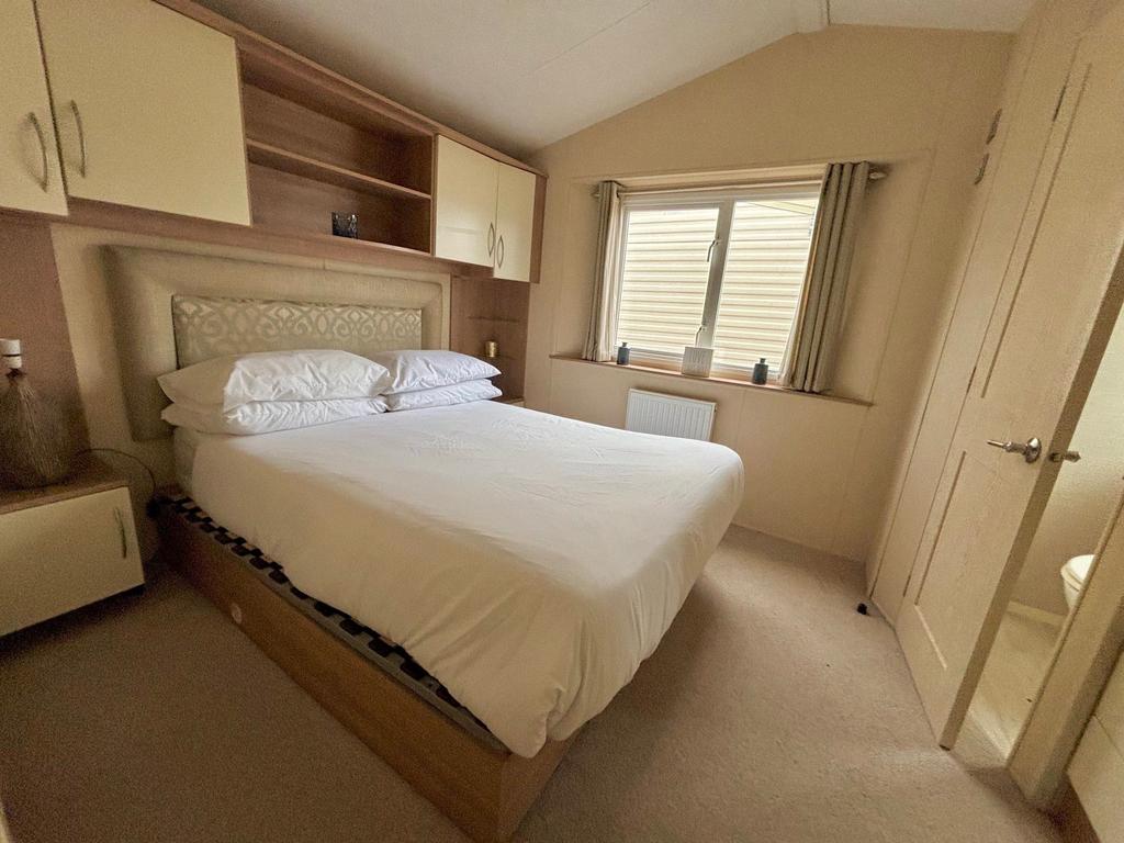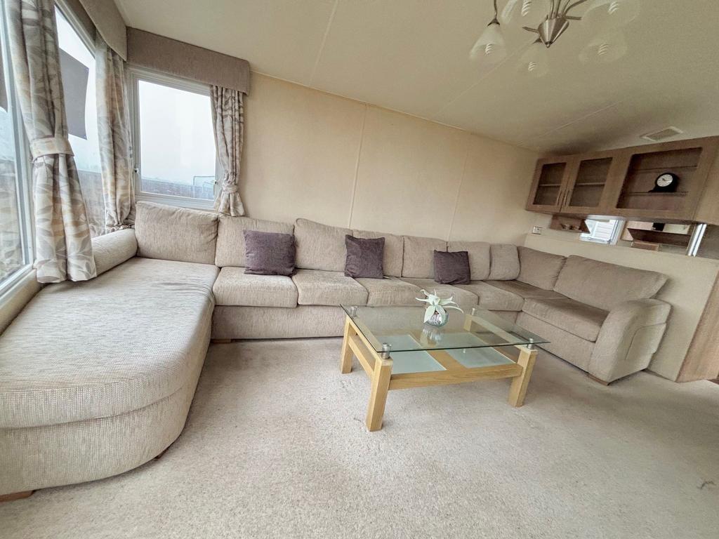 Inside, the caravan features a bright open-plan lounge and kitchen area, creating a welcoming space to relax after a day exploring the local coastline. The fully fitted kitchen includes a fridge-freezer, while double glazing and central heating help keep the caravan comfortable across the seasons.