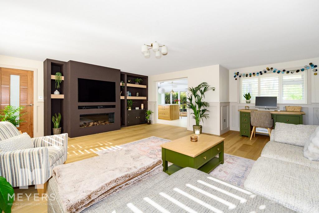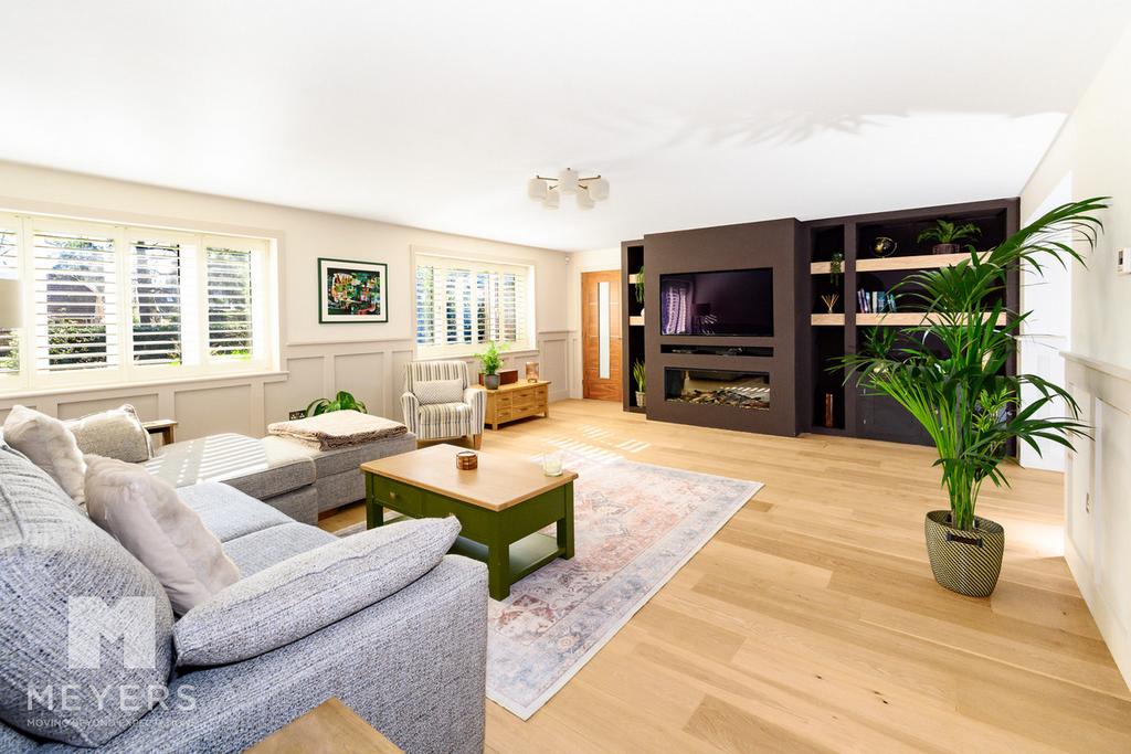 The sitting room is a beautifully proportioned and inviting space, designed for both relaxation and entertaining. It is seamlessly connected to the kitchen/dining room while also accessible from the hallway, creating a wonderful sense of flow. The room offers ample space for multiple seating arrangements and includes a dedicated area ideal for a home office or reading nook. A bespoke media wall with integrated shelving and an inset fireplace provides a striking focal point, while solid oak flooring, elegant wall panelling, and plantation shutters complete the refined aesthetic.