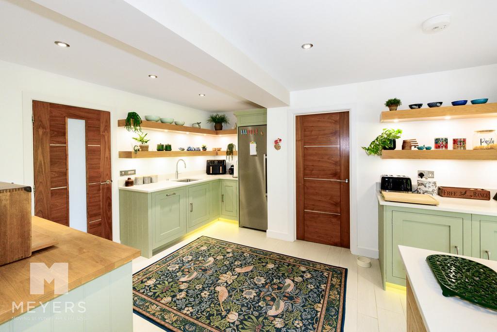 A particularly valuable addition, the second kitchen enhances the home’s versatility and is perfectly suited to multigenerational living, guest accommodation, or independent entertaining. It is well equipped with a Range Master five-ring gas cooker, extensive storage, a stainless steel sink, and space for freestanding appliances. The Worcester pressurised heating system is also neatly housed within this area.