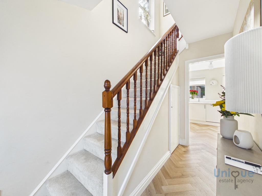 Bright welcoming entrance hallway fitted with beautiful herringbone flooring leading to the living room and kitchen with access to meters and understairs storage.