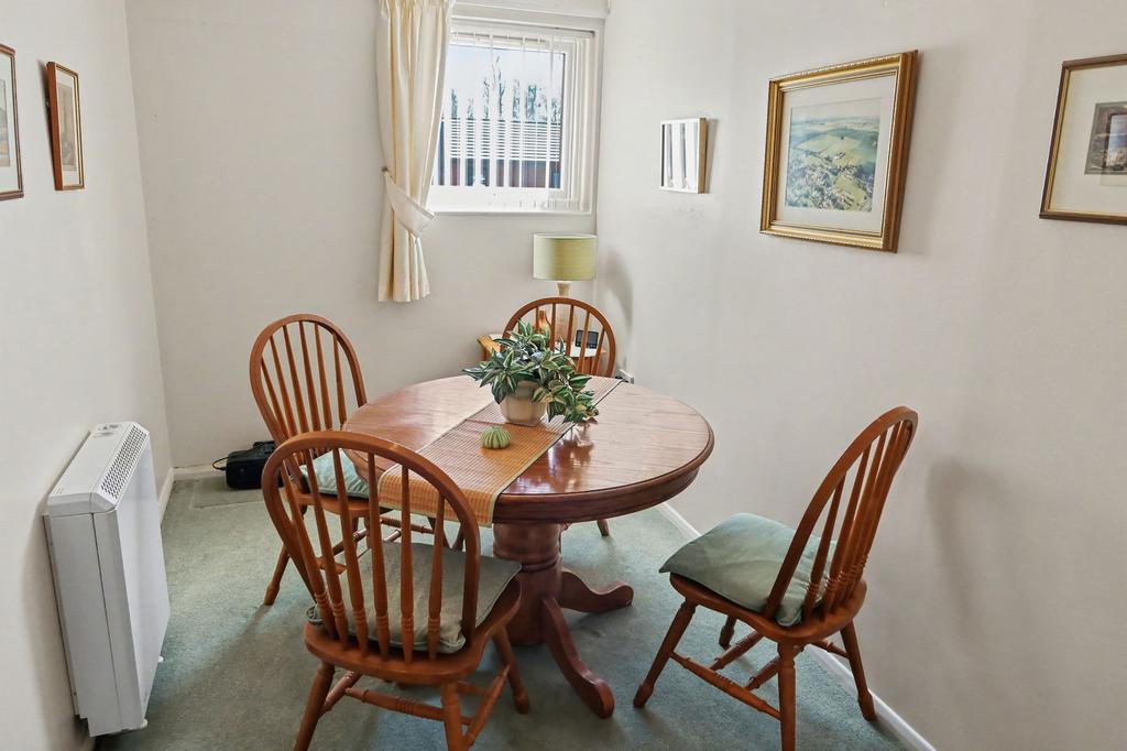 Living/dining room: Spacious living/dining area with space enough for sofa, table and chairs. Wall mounted night storage heater. UPVC double glazed window overlooks the car park.