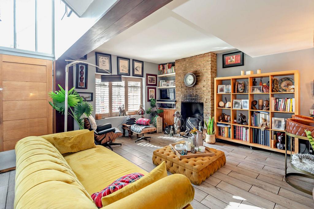 I am delighted to introduce "Gingerbread Cottage," (1010 sq ft) a quirky and charming extended end-of-terrace property located in "The Alberts." This delightful cottage is situated in a highly desirable and peaceful enclave, perfectly positioned close to Richmond town centre and the station. The home beautifully combines original period details with an eclectic mix of contemporary interiors. Upon entering, you will immediately notice the extended ground floor and generous open-plan living areas. The space features a lovely sitting area centered around a large, cozy open working log fireplace, a recessed dining area, and a bespoke fitted kitchen. Additionally, the ground floor includes a shower room and WC, and an inner hallway leads to a private walled courtyard garden. The first floor offers two well-proportioned bedrooms and a superb walk-in rain-drop shower room. There is also a further useful loft room on the top floor, and all bedrooms benefit from excellent built-in storage.