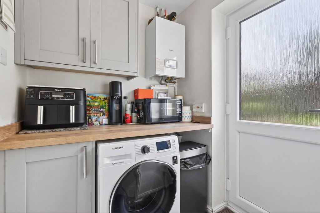 The kitchen leads through to a separate utility room with continued slate effect tiled flooring, additional eye and base level units with oak effect work surfaces, and space for a washing machine. A glazed door provides access to the rear garden and the guest WC.