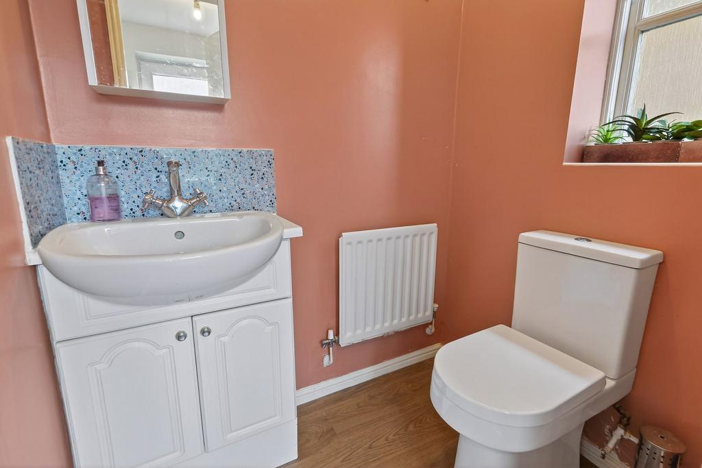 The downstairs WC comprises laminate flooring, a window to the side elevation, a wash hand basin with integrated storage, and a low-level WC.