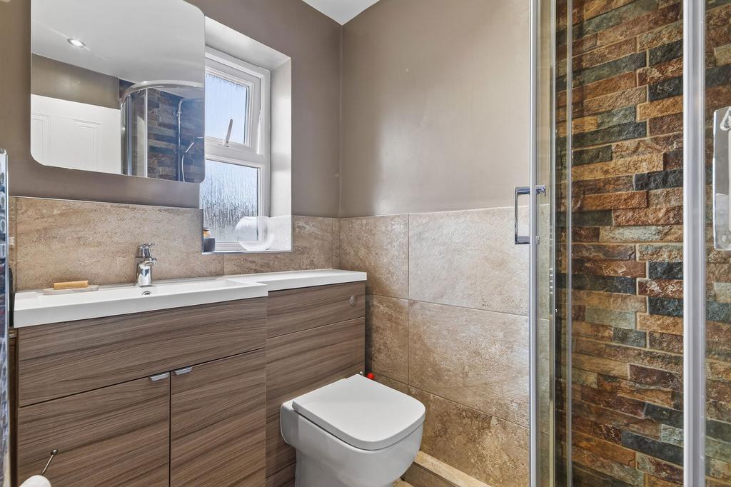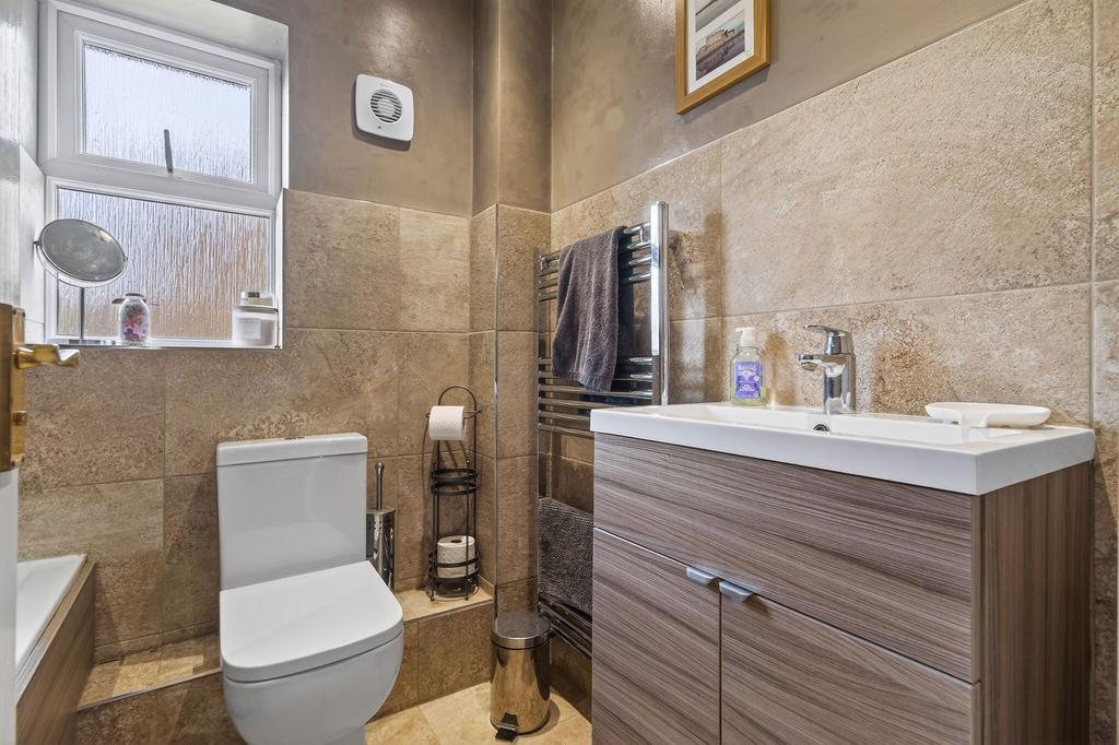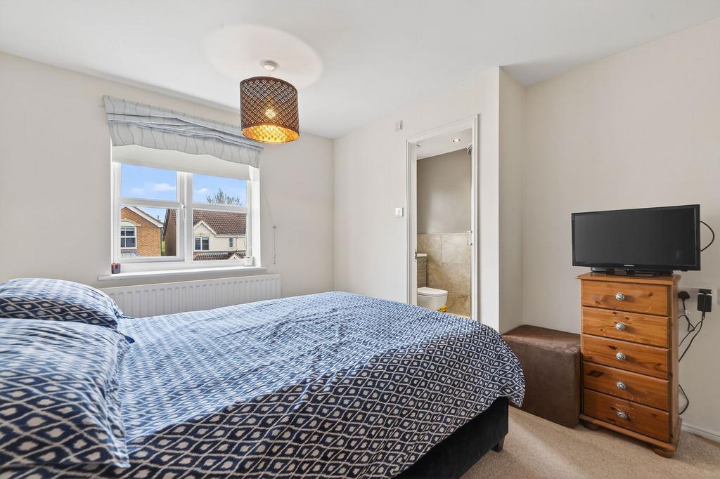 The beautifully presented main bedroom offers a generous size and features a window to the front elevation flooding the room with natural light, ample space for wardrobes and benefits from a modern en-suite shower room. The en-suite comprises floor and wall tiling, a chrome heated towel rail and a three-piece suite to include a corner shower cubicle, a vanity enclosed wash hand basin and a low-level WC.