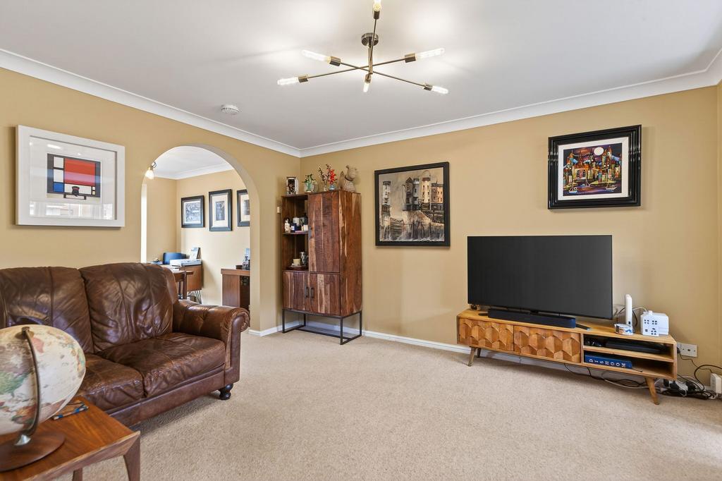 The well-proportioned living room is beautifully presented and features a bay window to the front elevation, flooding the space with natural light. Stairs rise to the first floor with a useful understairs storage cupboard, while an archway leads seamlessly into the dining area.