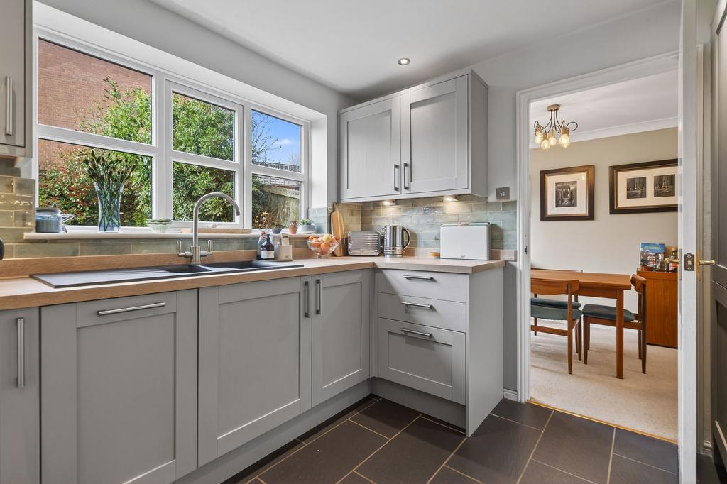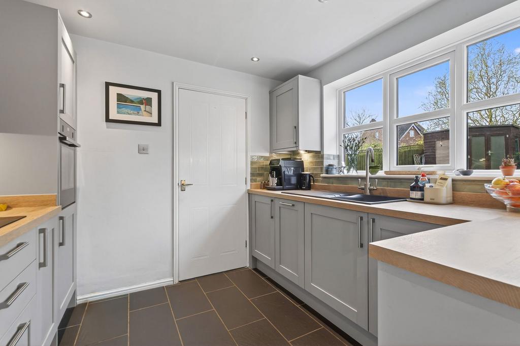 The modern kitchen is complemented by slate effect tiled flooring and fitted with a range of shaker-style eye and base level units with oak effect work surfaces. A composite one-and-a-half bowl sink with mixer tap and drainer sits beneath the window, while integrated appliances include a single oven, an induction hob, a fridge/freezer and a slimline dishwasher.