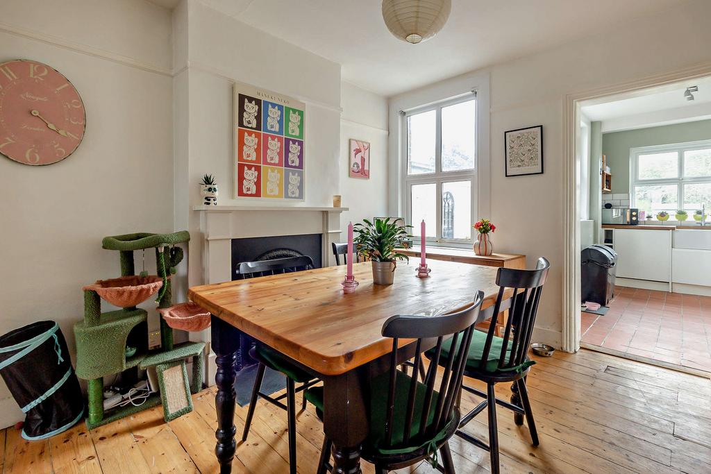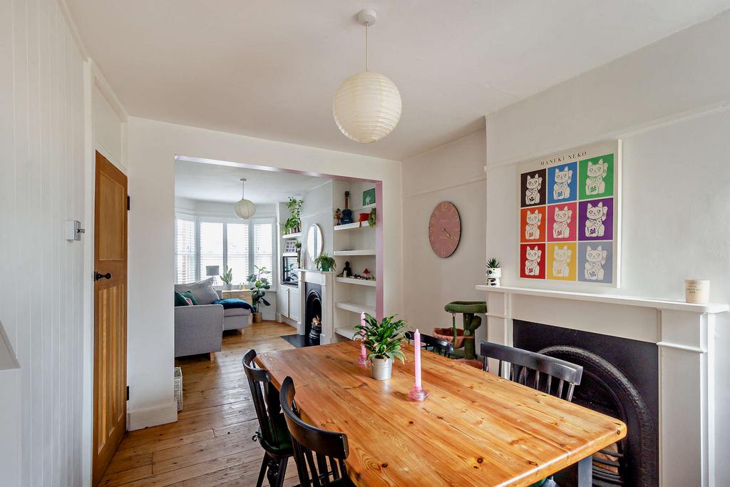 The spacious lounge boasts two built-in fireplaces, a front aspect bay window, a second window offering rear views and wood flooring. From here the room flows seamlessly to the kitchen.