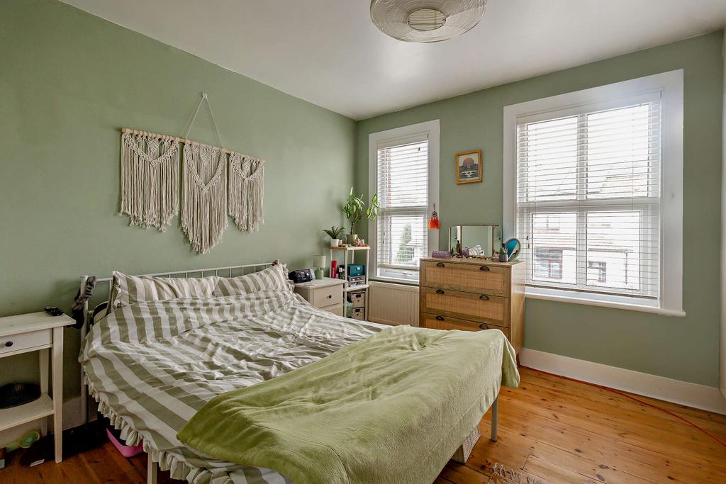 This double bedroom features windows with front views, a period sealed fireplace and wood flooring.