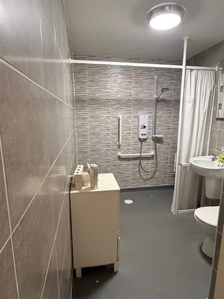 Wet room style bathroom comprising electric shower, wash hand basin and WC, tiled walls.