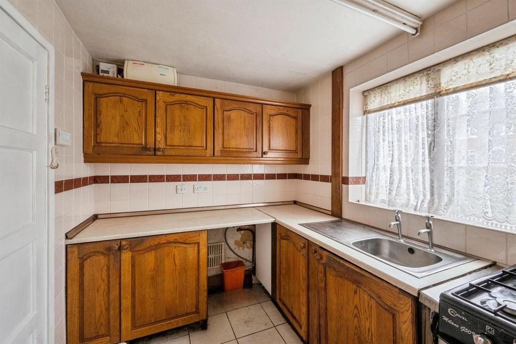 Fitted with a range of wall and base units with worktop over and a stainless steel sink with drainer. Having tiled splashbacks, space for a washing machine and cooker and a front facing double glazed window.