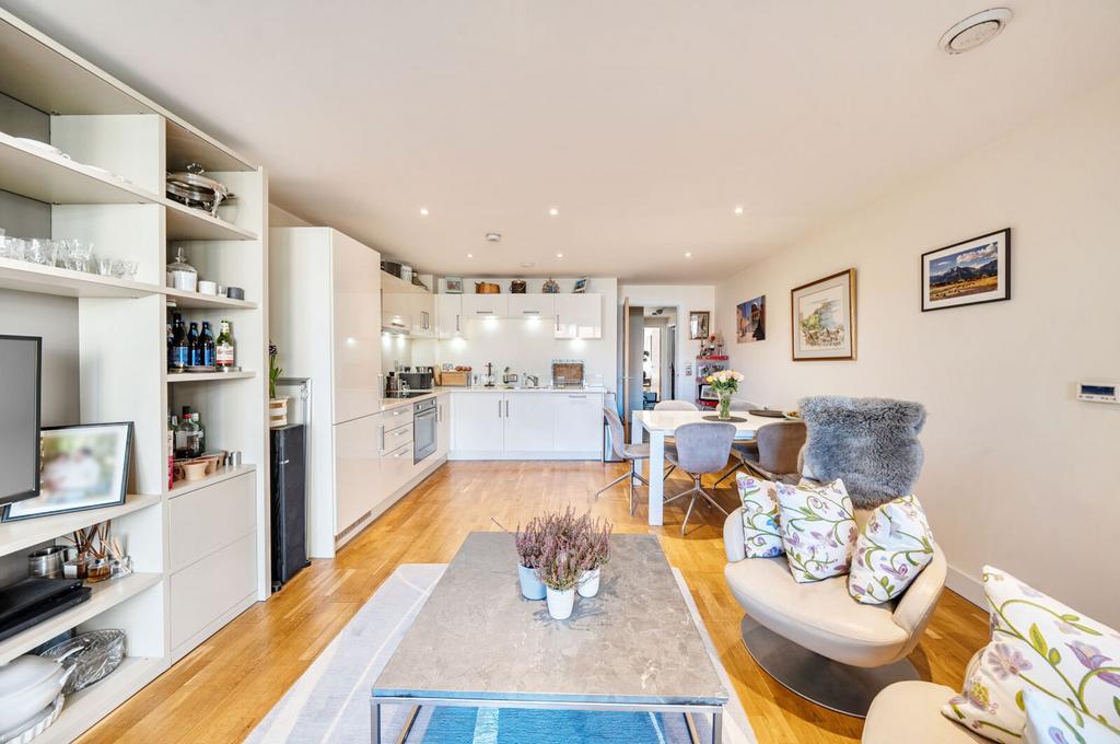 This superbly presented two bedroom flat is situated on the third floor of a popular and highly regarded development, offering a contemporary lifestyle in an enviable location. The property features a bright and spacious south facing living area, designed to make the most of the abundant natural light, with large floor-to-ceiling windows and direct access to a full width balcony (perfect for relaxing or entertaining) that enjoys sweeping views over the beautifully maintained communal gardens. The modern open-plan kitchen is thoughtfully laid out with integrated appliances and sleek cabinetry, ideal for both every-day living and entertaining guests. Both double bedrooms are generously proportioned and benefit from access to a second private balcony. The principal bedroom boasts a luxurious en-suite bathroom, while the second bathroom is equally well appointed with high quality fixtures and fittings. The property benefits from ample storage space, a welcoming entrance hall, and secure bicycle storage for added convenience. Residents enjoy the peace of mind provided by an attentive concierge service.