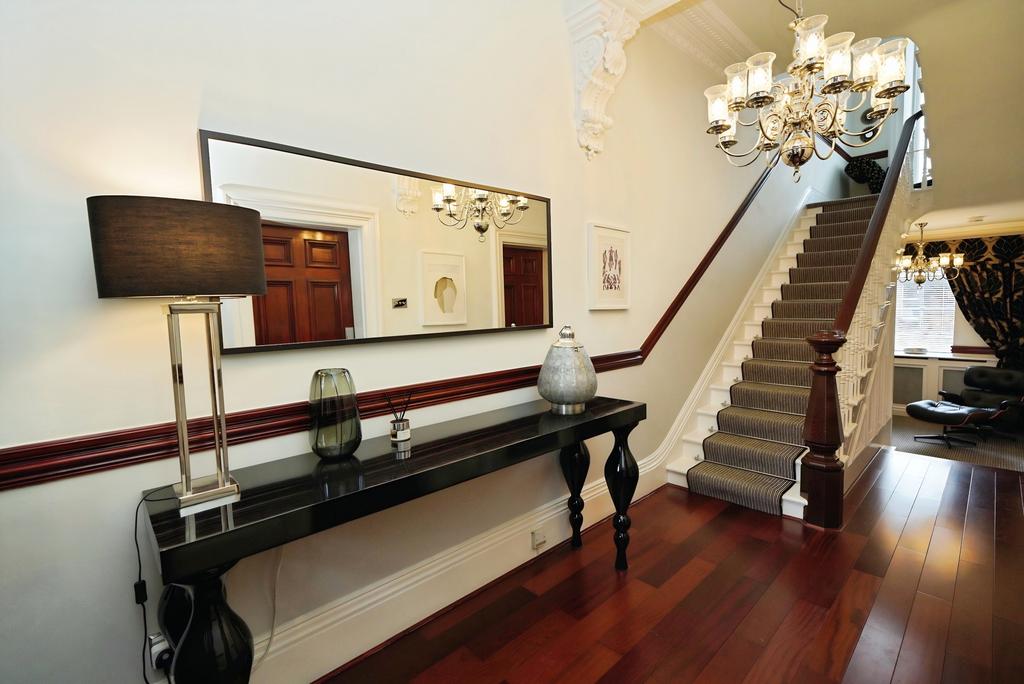 The spacious and versatile accommodation is arranged over four floors. The ground floor features an entrance vestibule, an impressive reception hallway, a generous lounge and an elegant dining room. The lower ground floor offers a superb family room with log burner, a beautifully appointed kitchen, utility room, and both front and rear entrance vestibules. On the first floor there is a principal bedroom with en-suite bathroom, along with a further bedroom benefiting from en-suite shower facilities. The second floor provides three additional well-proportioned bedrooms and a family bathroom, while the top floor offers a useful loft space currently utilised as a home office.