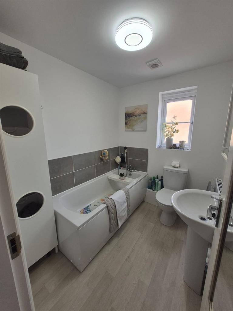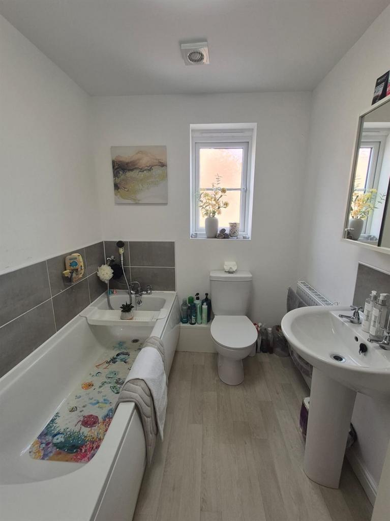 A beautifully designed & partially tiled suite, which comprises of a bath with a hose over, a W.C & a hand wash basin, a central heating radiator and a UPVC double glazed window.