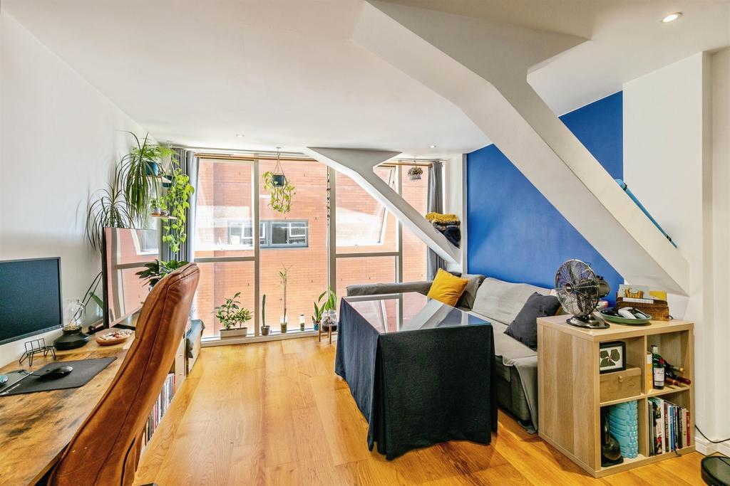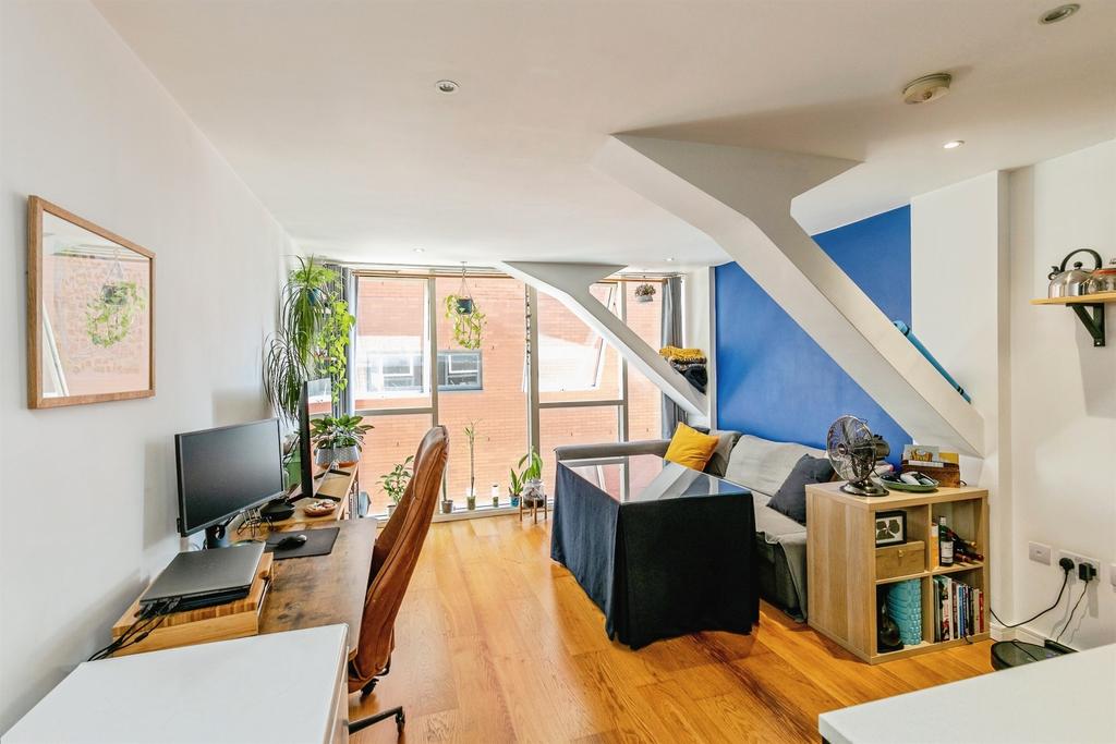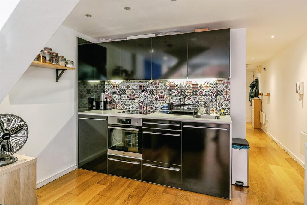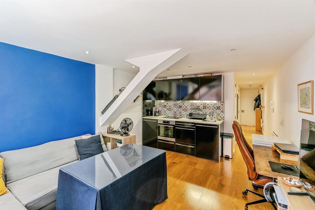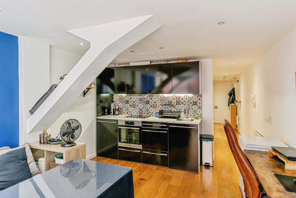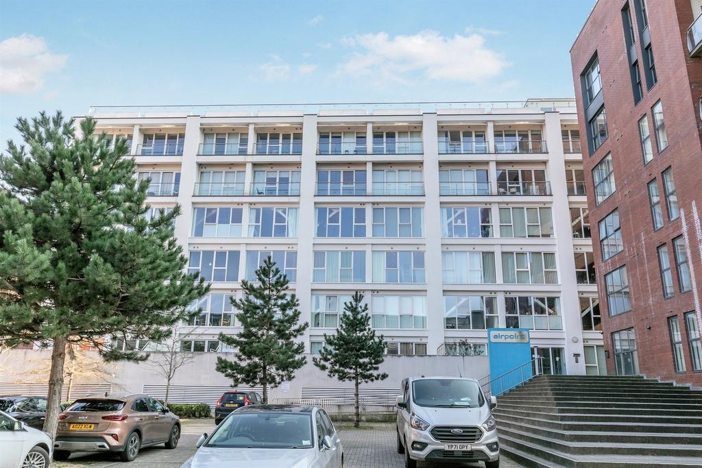 A bright one-bedroom apartment in the popular Airpoint development, offering open-plan living with floor-to-ceiling windows. The living area features wooden flooring and a modern fitted kitchen with integrated oven, electric hob, fridge/freezer and a new dishwasher.