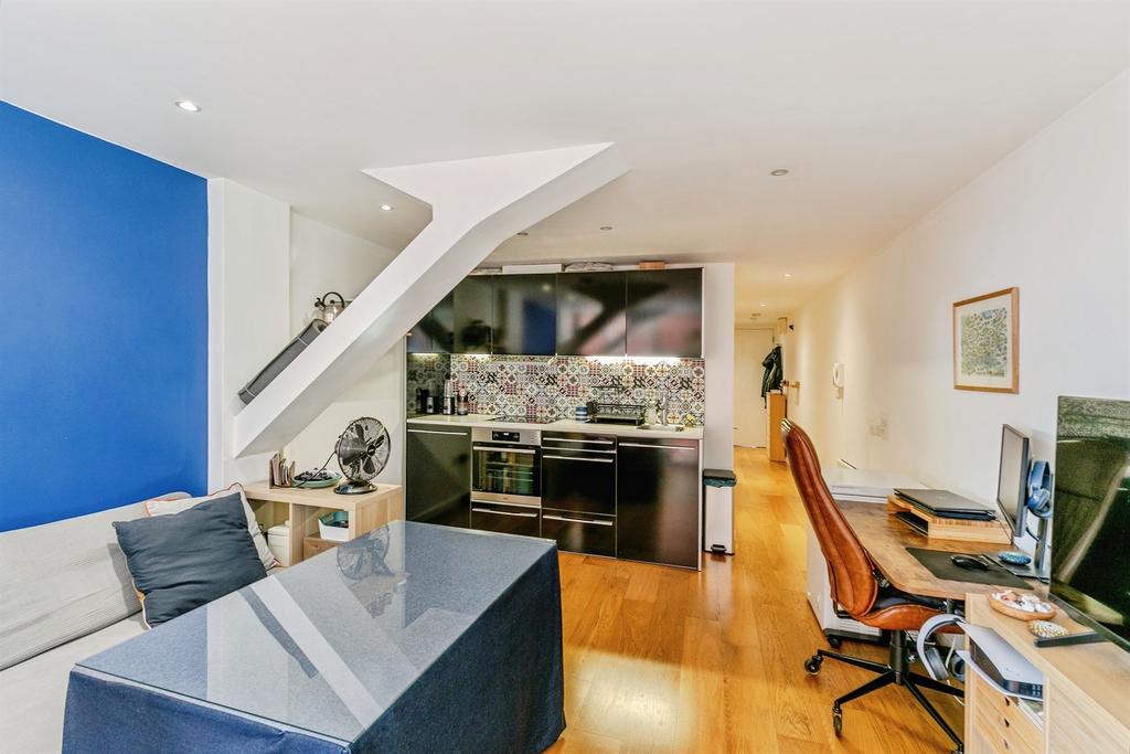 This bright, open-plan Kitchen/Living Room runs the full width of the property at the far end, offering a spacious and flexible layout for both cooking and relaxation. The kitchen is positioned along one side, featuring countertop space, cabinetry, and integrated appliance areas. Opposite the kitchen area is ample room for both seating and a dining setup. Natural light enters from the wide set of doors/windows at the end of the room, enhancing the sense of space.