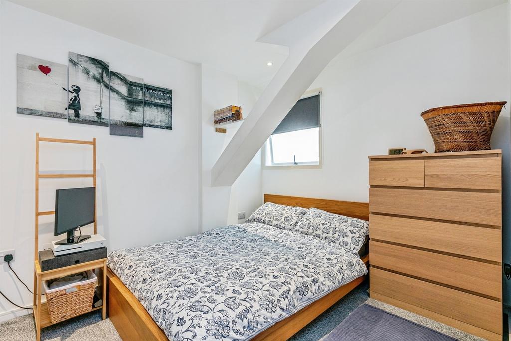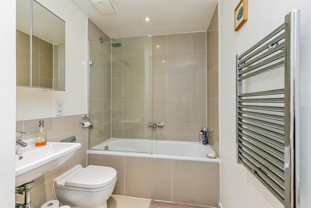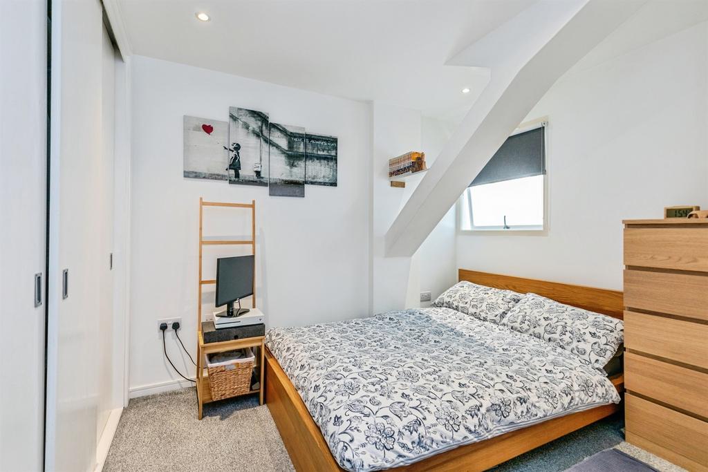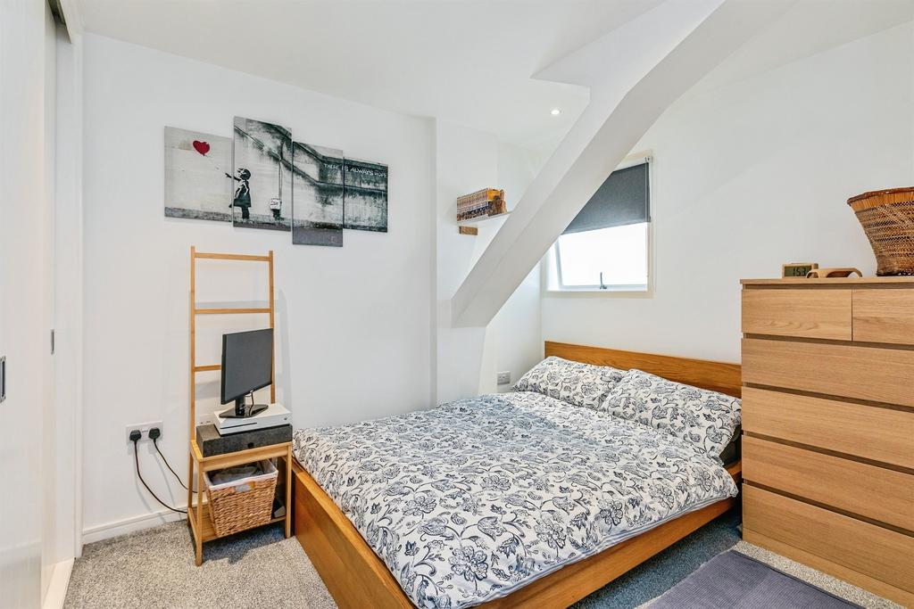The double bedroom has fitted wardrobes and new carpet, while the bathroom is fully tiled with a contemporary three-piece suite and shower-over-bath. Practical extras include secure bike storage and a communal post room.