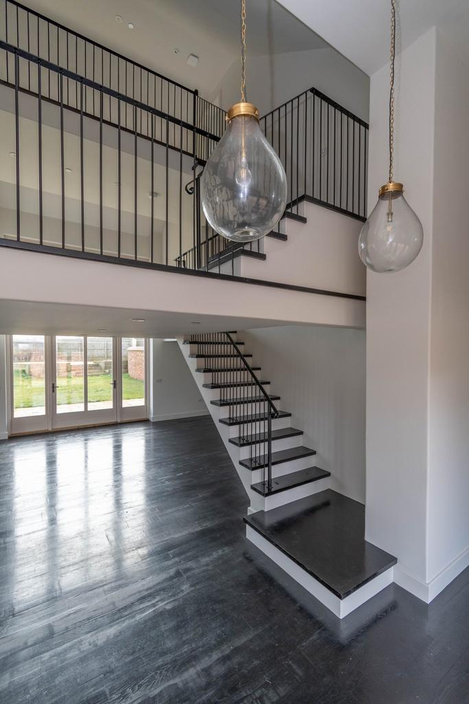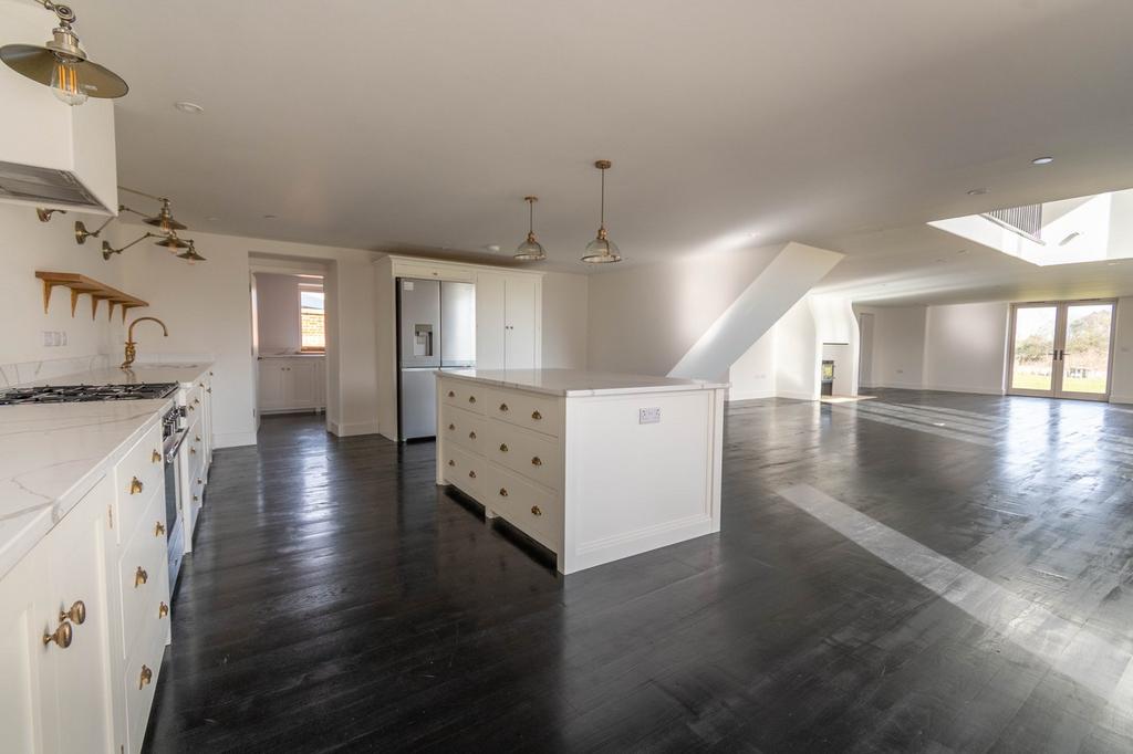 An open plan hallway with staircase to the galleried first floor landing and cloakroom and plant room off leads to the feature 17m kitchen/dining/living room. This stunning space has double height fully glazed doors to the rear garden and feature fireplace, with fabulous fitted kitchen to one end, with utility off and study off the living area. The whole floor is flooded with natural light and, in addition to the feature doors, there are multi aspect windows and doors affording access to and views over the gardens.