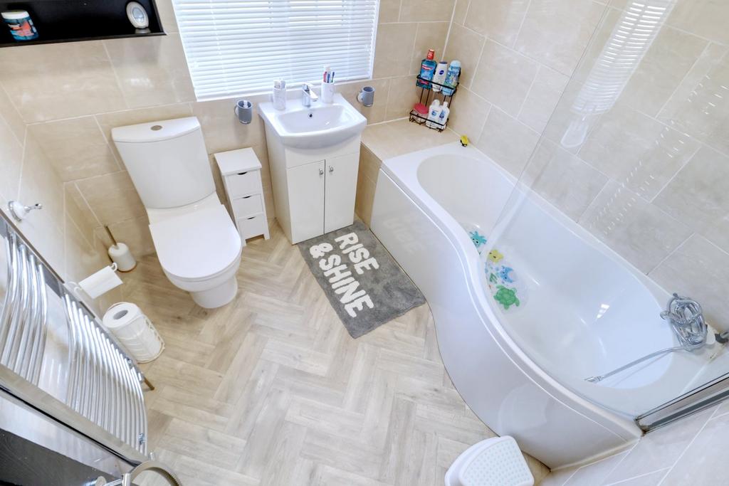 2.24m x 2.1m (7' 4" x 6' 11") Obscure double glazed windows to rear, P-shaped panelled bath with shower attachment, low-level flush WC, hand wash basin set on base units, chrome hand towel radiator, tiled walls, vinyl flooring.