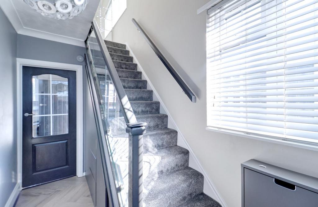 Eye-level storage cupboard housing electricity meter and fuse box, double glazed windows to side, modern black radiator, touch-close understairs storage cupboards, modern parquet effect laminate flooring, carpeted stairs to first floor, access to accommodation.