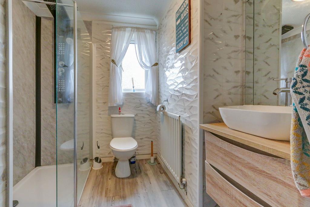 The two further bedrooms are both good doubles, and the family bathroom has been upgraded with another walk-in shower enclosure and a floating vanity unit with a vessel sink.
