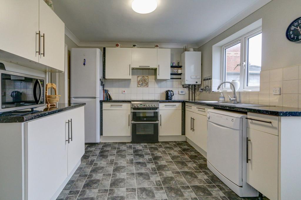 The kitchen is a solid working kitchen with white units, dark granite-effect worktops, a cooker and a dishwasher, with a separate utility room off the back - so the washing machine and dryer stay out of sight where they belong.