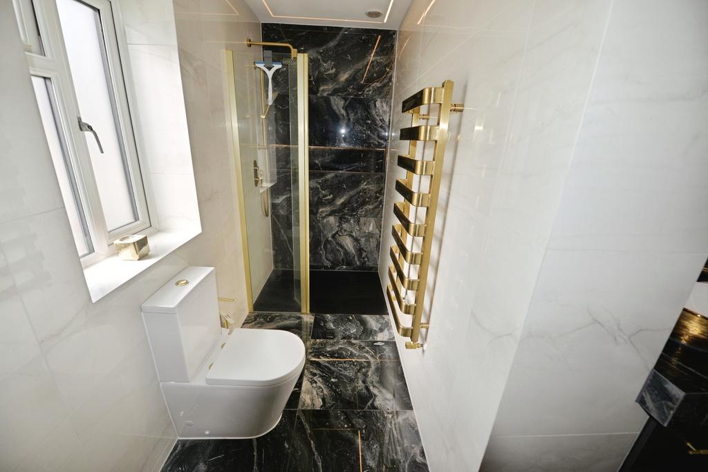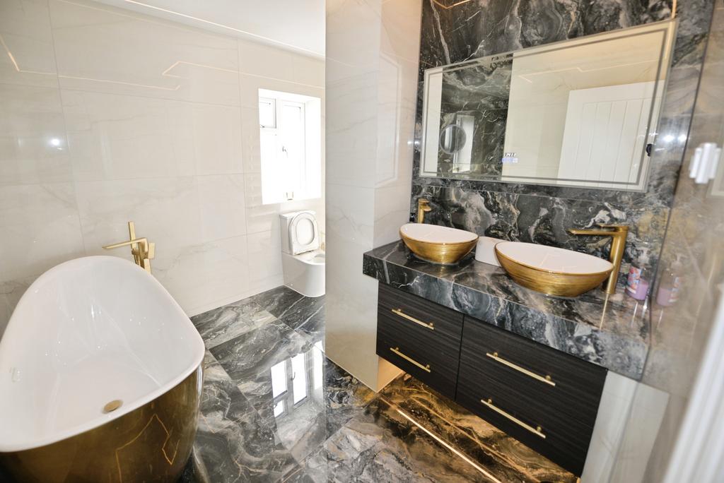 Upstairs, the first floor comprises three well-proportioned double bedrooms, each comfortably accommodating a double bed, alongside a luxurious family bathroom finished with Italian porcelain tiles, underfloor heating, a striking freestanding gold bath, walk-in wet room shower, and twin his-and-hers basins.